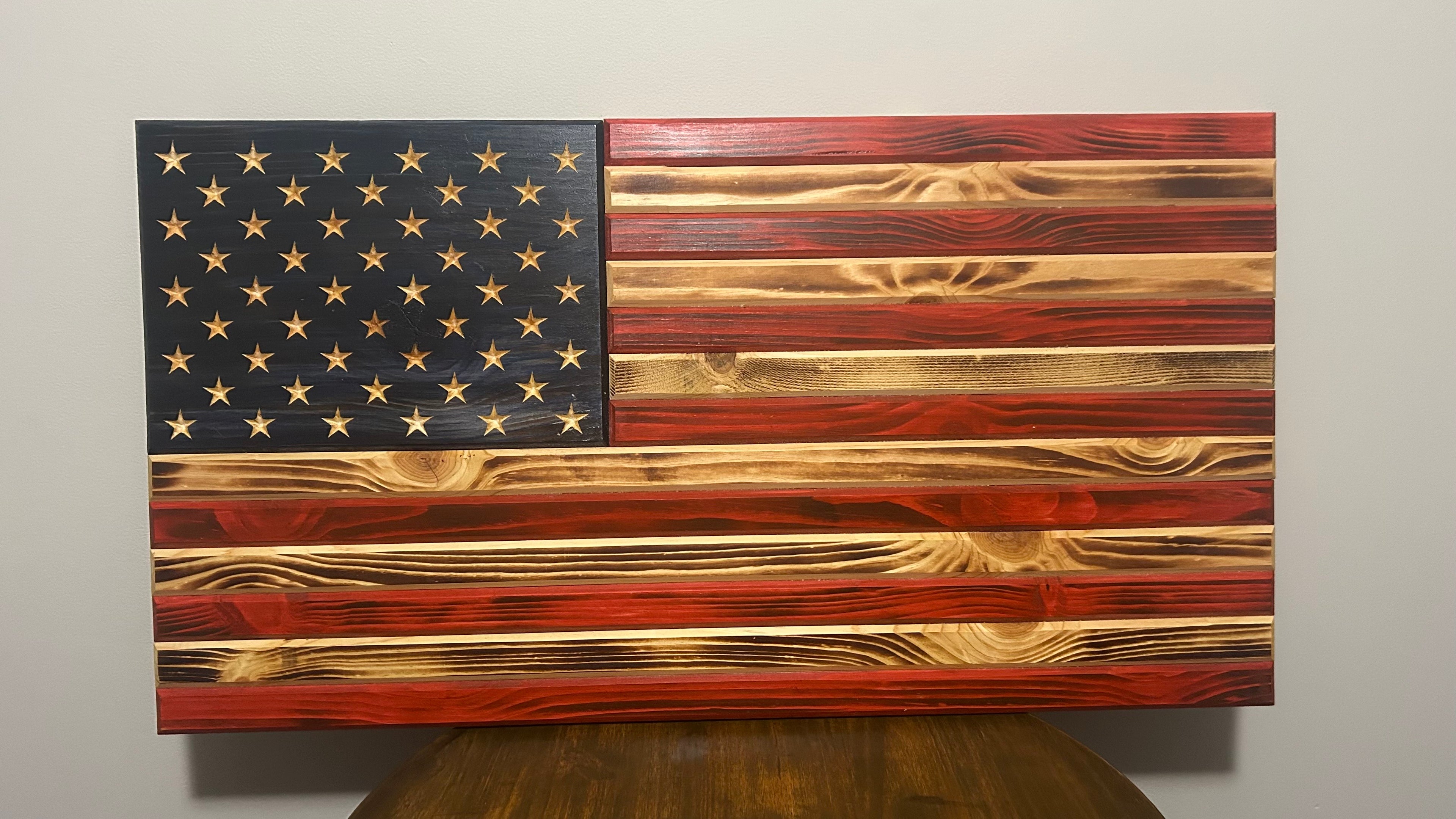 Handcrafted Wooden American Flag – Rustic Pine, Torched Finish, CNC Stars, Outdoor-Protected, Made in USA